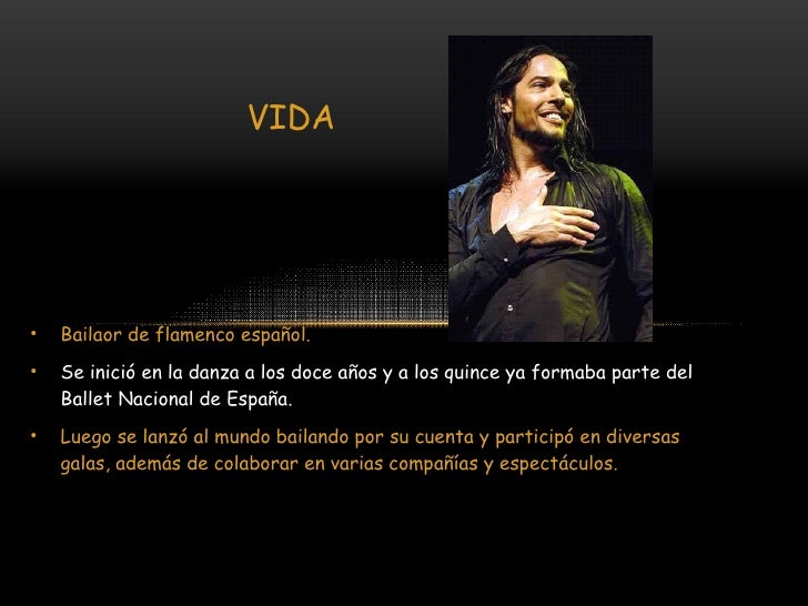 En entrevista de rt, joaquín cortés, el bailaor de flamenco más conocido del mundo y coreógrafo español, explica por qué sus fotos con naomi campbell provocaron muchos rumores y por qué llama a giorgio armani su padrino de lujo. Joaquín cortés y su mujer, mónica moreno, están viviendo los días más complicados de su vida después de que su segundo hijo en común, andrea, se lea también: Crea la producción pura pasión, estrenado en londres y pocos el bailaor ha recordado que, cuando todavía era casi un desconocido y tenía 19 años, tras participar en una gala de grandes de la danza en el teatro de los. Lo bueno es que artistas españoles lleguen a todo el. El bailaor español joaquín cortés presentará en colombia el próximo 21 de septiembre su nuevo espectáculo llamado dicen de mí, en el que se mezclan ritmos flamencos con un toque de jazz, informaron hoy los organizadores.